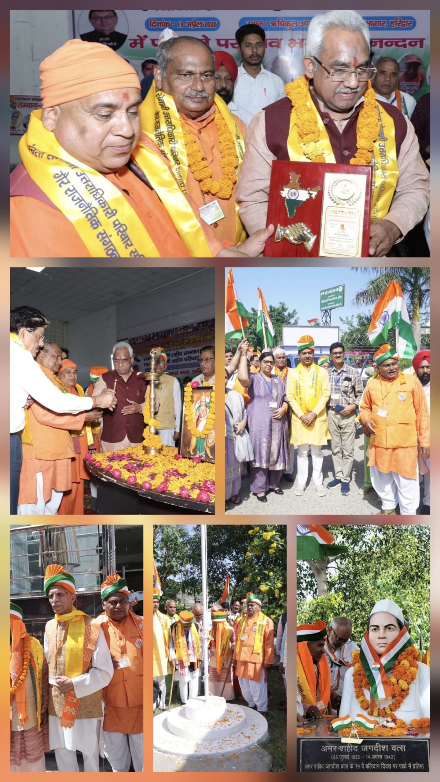 हरिद्वार 13 अप्रैल। जालियांवाला बाग नर संहार की 107 वीं वर्षगांठ की स्मृति में स्वतंत्रता संग्राम सेनानी उत्तराधिकारी परिवार समिति द्वारा आयोजित एक दिवसीय सम्मेलन में भारत भर के विभिन्न प्रांतों से आए वयोवृद्ध स्वतंत्रता सेनानियों और उत्तराधिकारियों ने बडी संख्या में शामिल हुए। 116 साल के स्वतंत्रता सेनानी स्वामी लेखराज और शतायु श्री आनंद सिंह बिष्ट को देख भाव विभोर हुए सेनानी उत्तराधिकारीयों ने उनकी चरण रज लेकर उनके प्रति अपना सम्मान और आभार व्यक्त किया।